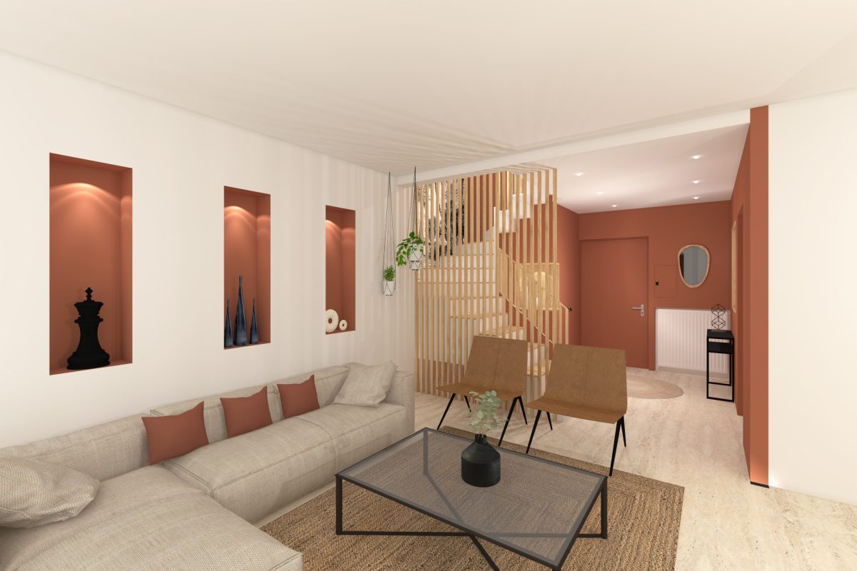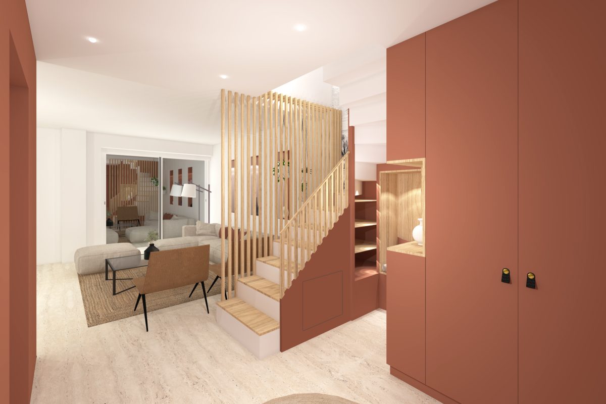 L’enjeu de ce projet a été de délimiter l’entrée sans la fermer, la rendre plus fonctionnelle et plus accueillante. Le terracotta a la particularité d’être chaleureux et naturel tout étant très lumineux c’est donc la couleur qui va structurer l’espace. Des rangements ont été complètement intégrés avec une assise et un claustra bois pour le garde corps. Le papier peint vient également dynamiser l’espace de la cage d’escalier.