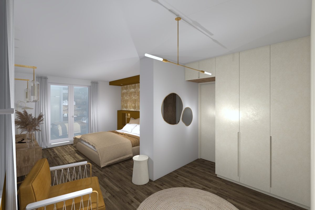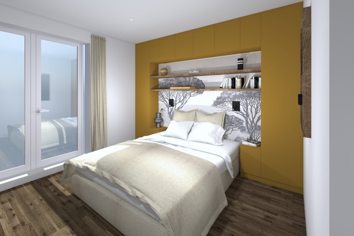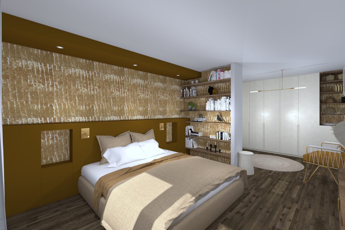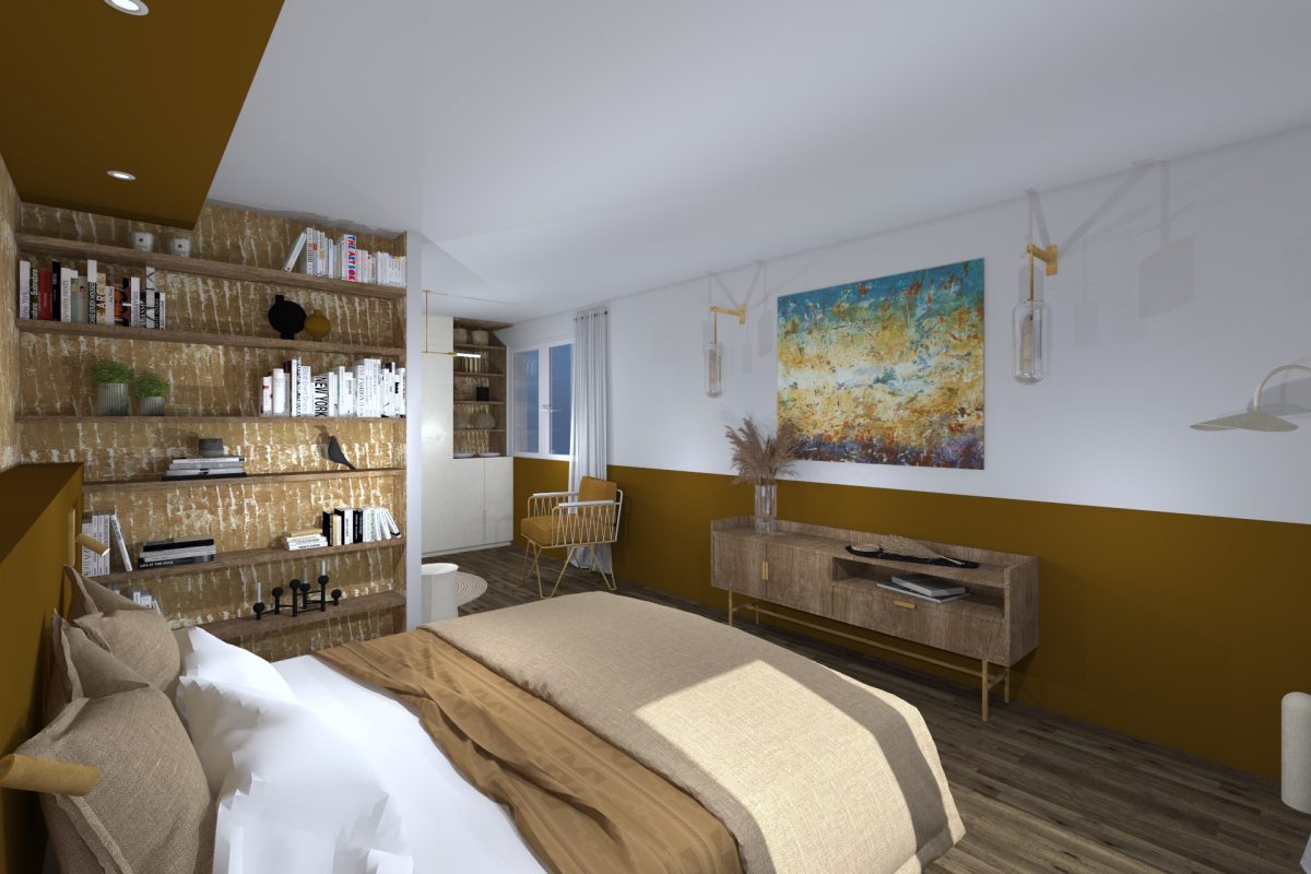 Pour le coin nuit la suite parentale vient s’illuminer sous les nuances de moutarde avec son joli papier peint en tête de lit. Un dressing totalement intégré et un coin bibliothèque viennent compléter l’espace à l’ambiance chic et chaleureuse.